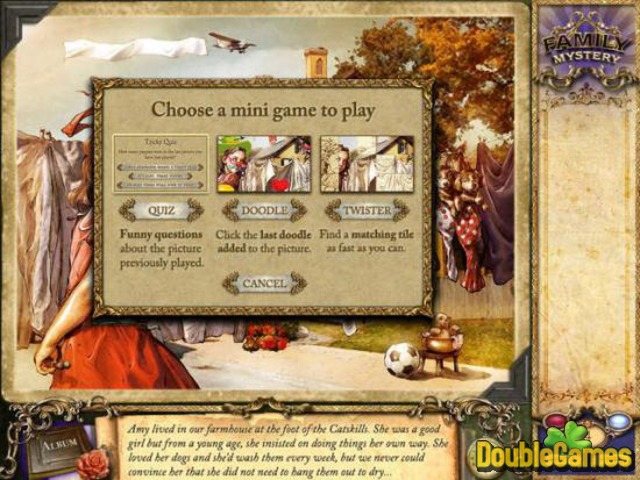 Giocando a Family Mystery – The Story of Amy incontrerai un’orfana chiamata Amy che aveva sempre sognato di sapere la verità sui suoi genitori. Nonostante ciò i nonni di Amy non dicono niente sul passato di Amy. Amy trova il diario di sua nonna e un vecchio album di foto della famiglia. Questi documenti rivelano i dettagli interessanti e scioccanti davanti a Amy quando lei comincia a studiarli. Aiuta Amy a scoprire il suo passato e sa tutto dei 15 membri della sua famiglia. Scarica Family Mystery – The Story of Amy assolutamente gratis e immergiti nel mistero della famiglia!