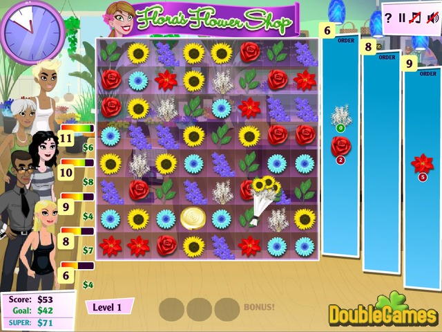 Le rose, calla, margherite sono bellissime, vero? Deliziati della bellezza di questi fiori nel nuovissimo gioco del genere match 3 intitolato Flora’s Flower Shop. Incontra Flora, la migliore fiorista in tutta la città e aiutala a servire tanti consumatori, quanti siano possibili. Trasformati in una vera maestra di tutti i tipi di fiori! Assicurati di venderne abbastanza per raggiungere il Tuo scopo ogni giorno. Gioca a Flora’s Flower Shop online assolutamente gratis e mettiti le abilità match 3 alla prova!