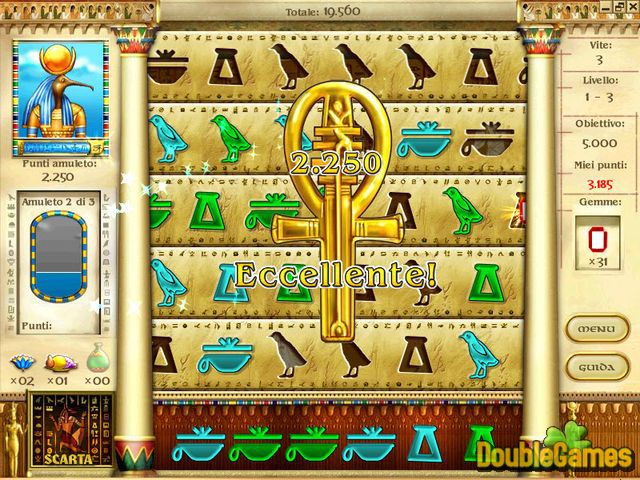 Metti alla prova la tua resistenza mentale con questo gioco basato sull'Antico Egitto in cui dovrai cercare di placare gli dei. Unisci i simboli colorati e collocali nelle file che ruotano in modo da farli sparire. Gioca in maniera veloce e cerca di mettere insieme anche forme dello stesso colore per ottenere bonus e regali speciali che facciano felici gli dei, ma solo se sarai sveglio e attento sarai premiato con degli amuleti! Grafica eccezionale, gioco appassionante e 100 livelli fanno di Mysteries of Horus un titolo adatto a tutta la famiglia!