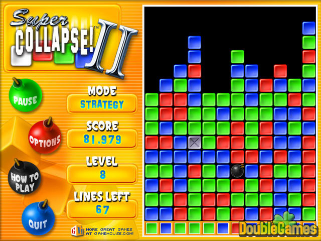 Pensi di essere diventato un campione di Collapse! Allora la nuova versione ti toglierà il sonno grazie ad una dose massiccia di divertimento! Lo scopo del gioco è ancora di fare esplodere dei gruppi di 3 o più blocchi dello stesso colore, prima che questi raggiungano la parte in alto dello schermo. Potrai scegliere tra le modalità di gioco Puzzle, Strategy o Relaps, in cui i blocchi arrivano sia dall'alto che dal basso dello schermo. Nuovi pezzi con poteri speciali e tante nuove opzioni di gioco. Super Collapse! II è divertimento a più non posso!
